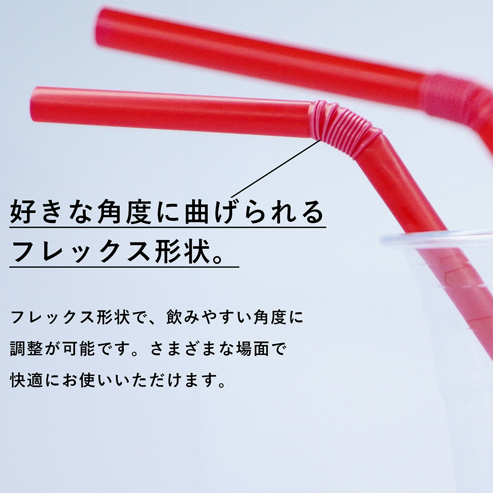 | ここがポイント | 【フレックスタイプストロー】 折れ曲がるフレックスストロー500本入り。 【たっぷり使える業務用】 業務用で500本入っておりますので、テイクアウトアイスドリンク用としてたっぷりお使いください。 |